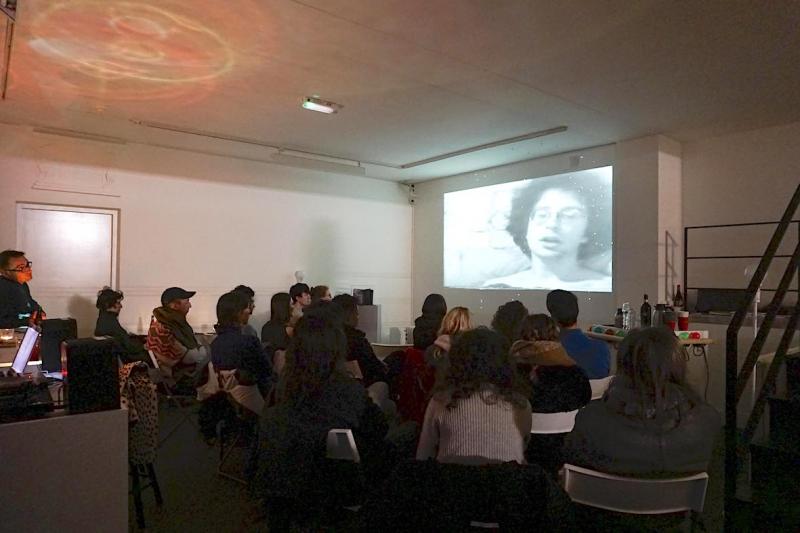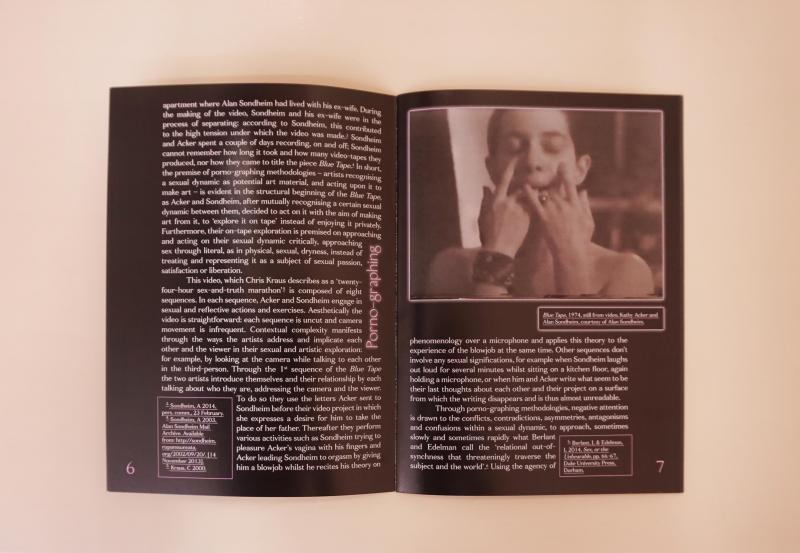 In her research, Pinaka uses the term porno-graphing to group together and examine lens-based artworks where artists use material sexual situations or sets of sexual dynamics present in their lives and independent of their practices, to make art. Pinaka considers how artists act upon these sexual situations, the art-results they produce, and their means of sharing them with an audience. These situations and dynamics share commonalities as they can be regarded as ‘taboo’ or ‘transgressive’; also, in that artists use them to underline the ‘dirtiness’ or ‘wrongness’ of their sexual and artistic subjectivities. For example, Kathy Acker with Alan Sondheim, after recognising the sexual dynamic between them as work-material, they act upon it to make art (instead of treating it as private enjoyment) and to do so they self-objectify into certain roles. In the Blue Tape, discussions of art, romantic love and phenomenology are talked-through video sequences of sexual stimulation and negation as a way of deliberating and reorganizing meaning and value.