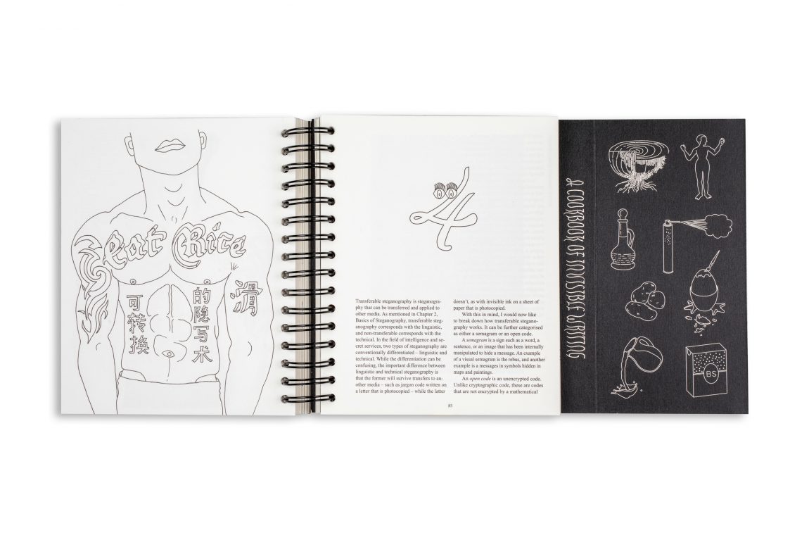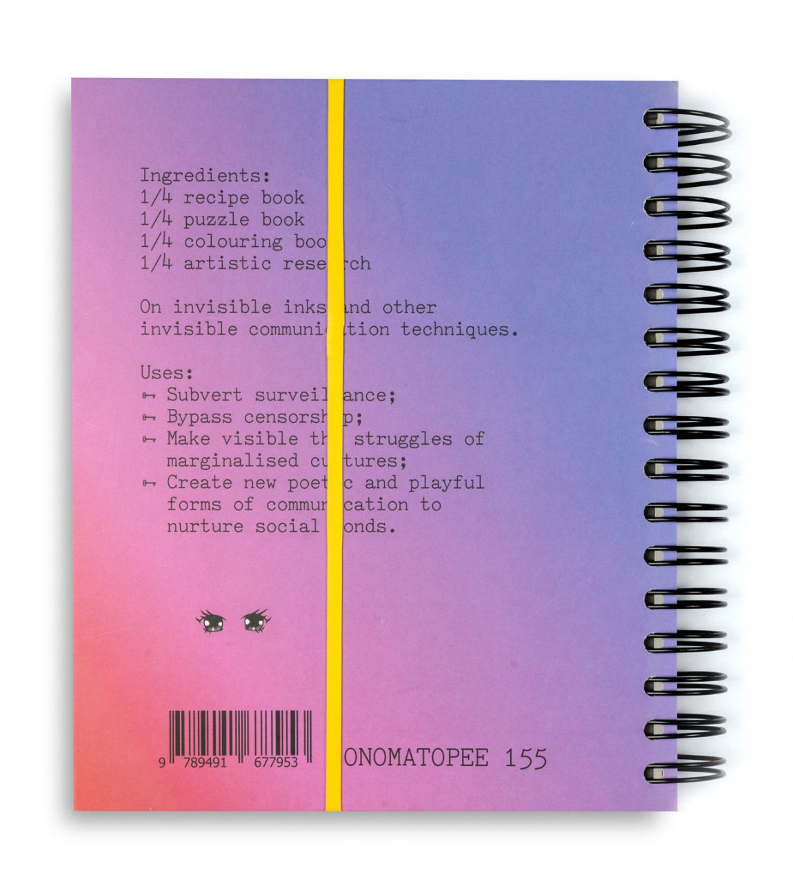 ‘A Cookbook of Invisible Writing’, written and designed by Amy Wu, is an introduction to analog steganography, a type of secret writing that is hidden in plain sight. It is an invisible ink colouring book, recipe book, puzzle book and artistic research book. This book also serves as a starter pack to run workshops for those who are interested in alternative forms of communication. A Cookbook of Invisible Writing provides a wide variety of invisible ink recipes and other communication techniques that may be used to subvert surveillance, bypass censorship and make visible the struggles of minorities and other marginalised cultures. Additionally, it aims to inspire communities to develop their own new poetic and playful forms of communication as a way of nurturing social bonds.
