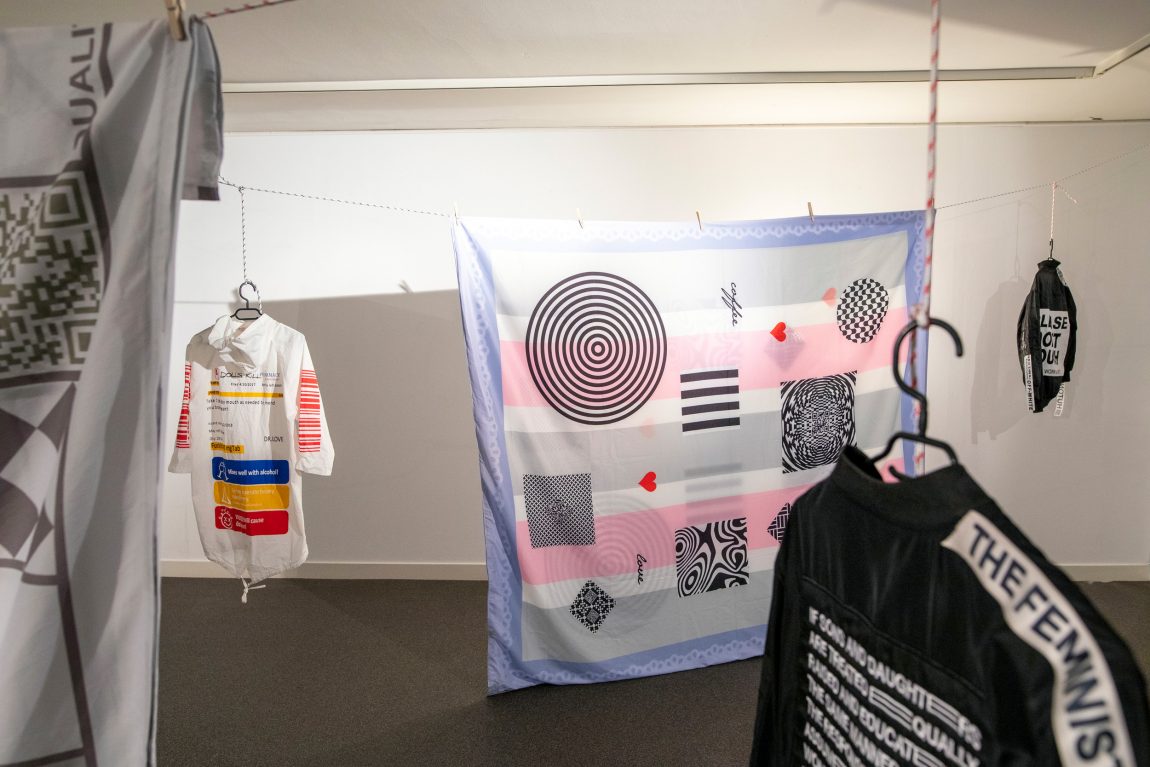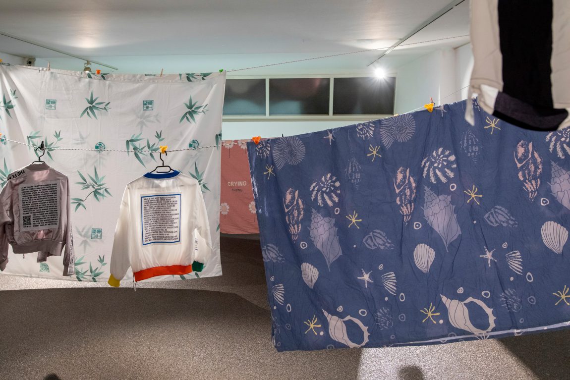 Hutong Whispersco-opts three elements that are omnipresent in the Chinese urban landscape, namely bed sheets, Shanzhai fashion (a Chinese phenomenon that features nonsense English), and QR codes.