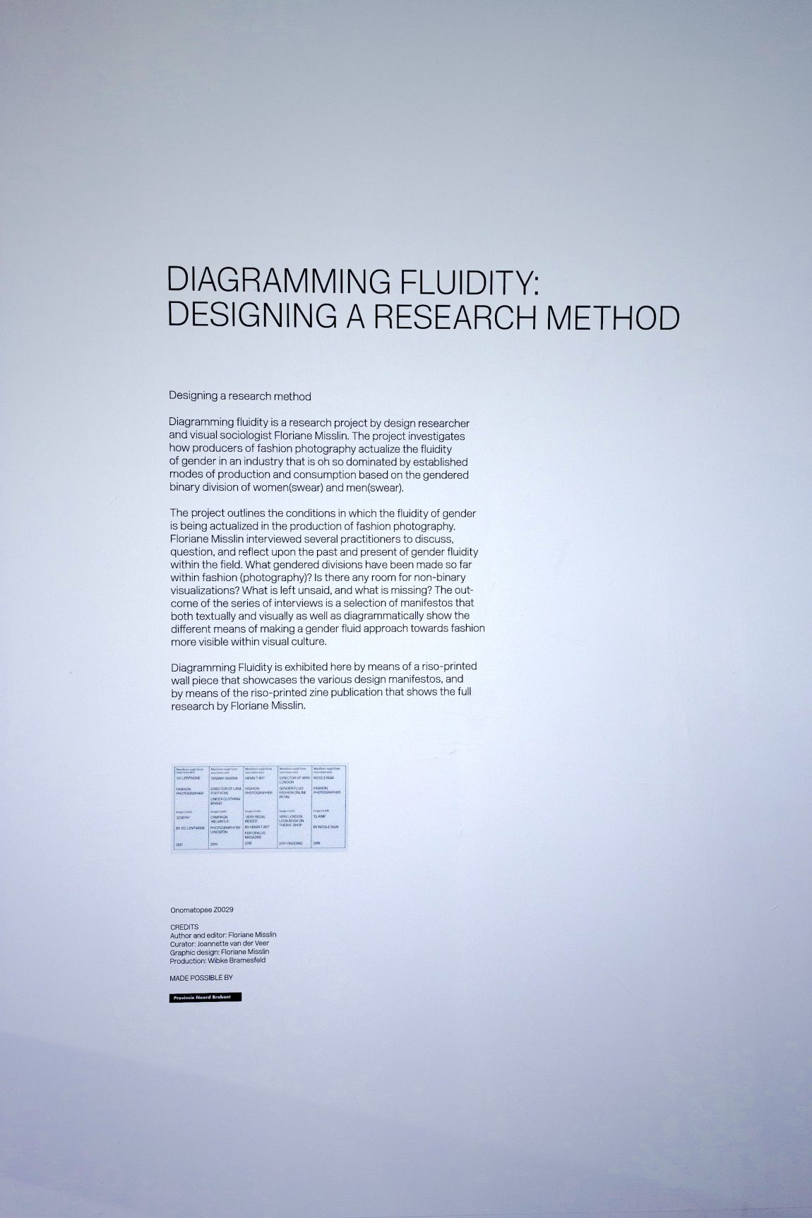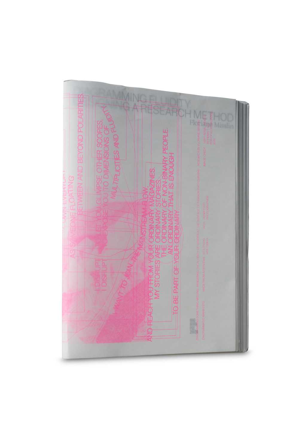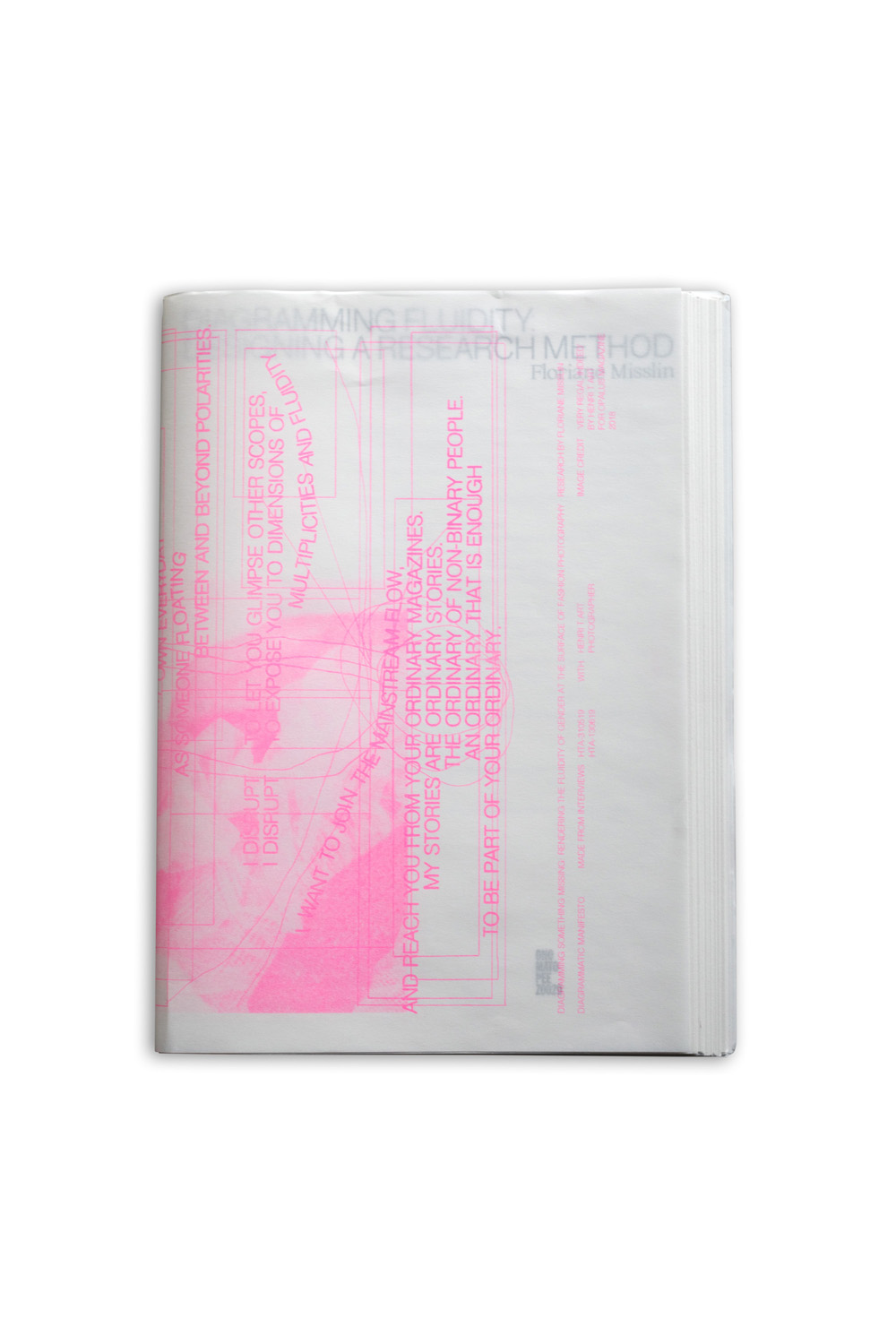 The project outlines the conditions in which the fluidity of gender is being actualized in the production of fashion photography. Floriane Misslin interviewed several practitioners to discuss, question, and reflect upon the past and present of gender fluidity within the field. What gendered divisions have been made so far within fashion (photography)? Is there any room for non-binary visualizations? What is left unsaid, and what is missing? The outcome of the series of interviews is a selection of manifestos that both textually and visually as well as diagrammatically show the different means of making a gender fluid approach to fashion more visible within visual culture.