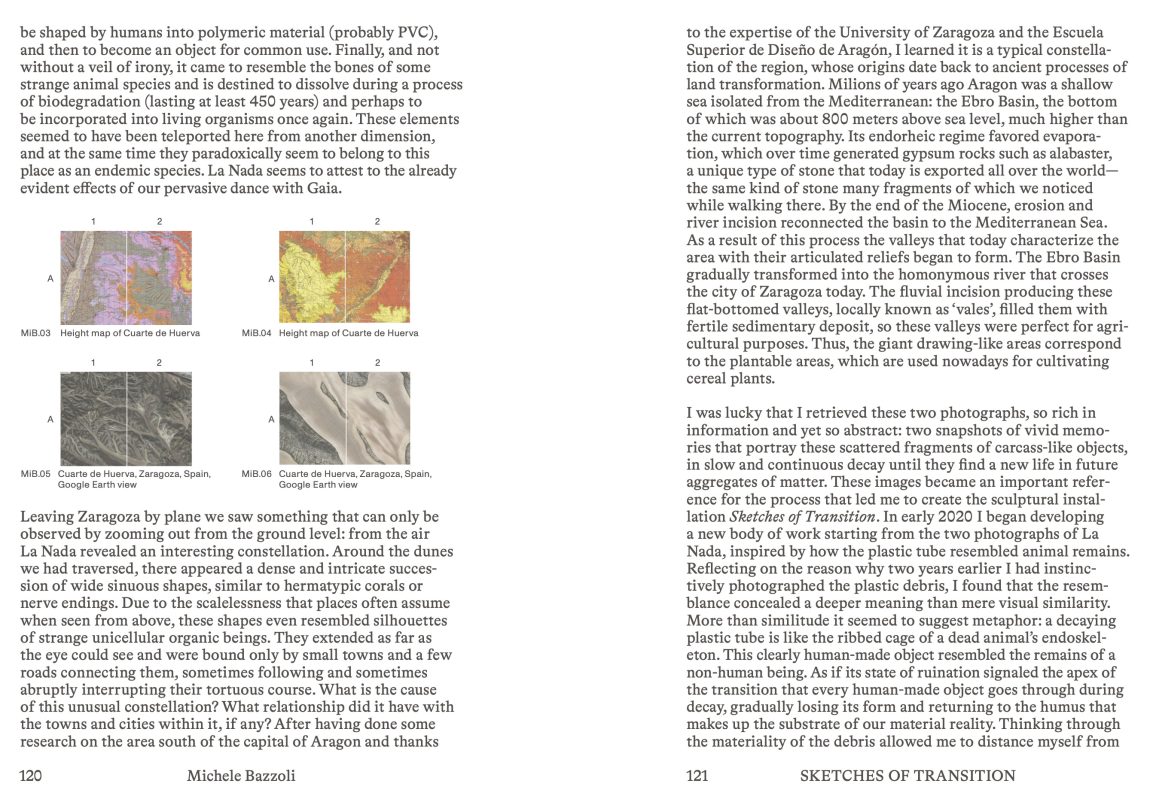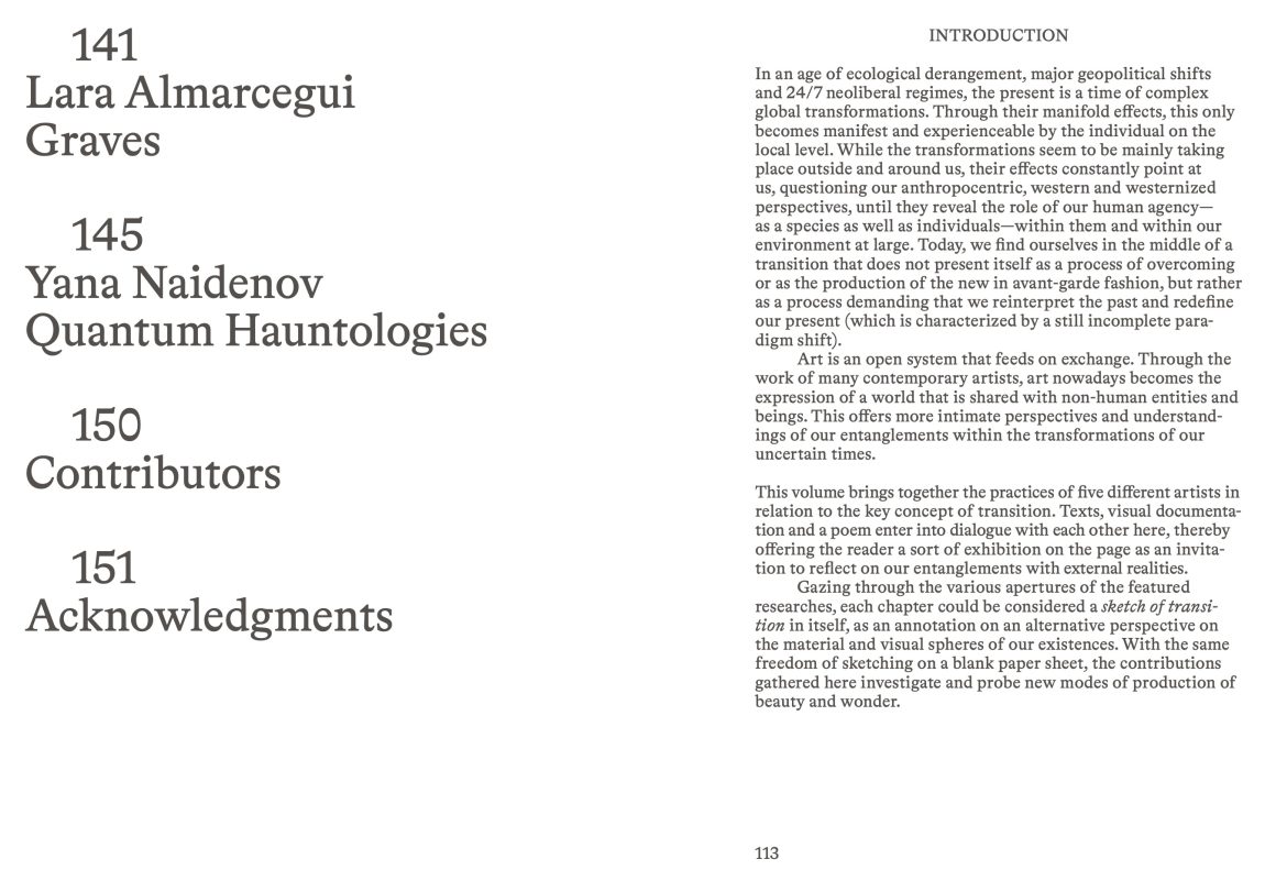 This volume brings together the practices of five different artists in relation to the key concept of transition. Texts, visual documentation and a poem enter into dialogue with each other, offering the reader a sort of exhibition on the page. An invitation to reflect on our entanglements with external realities.