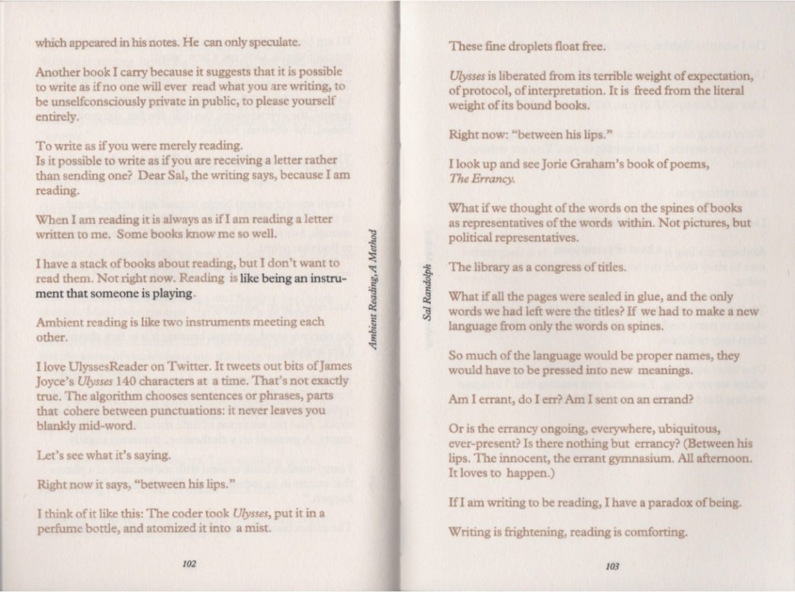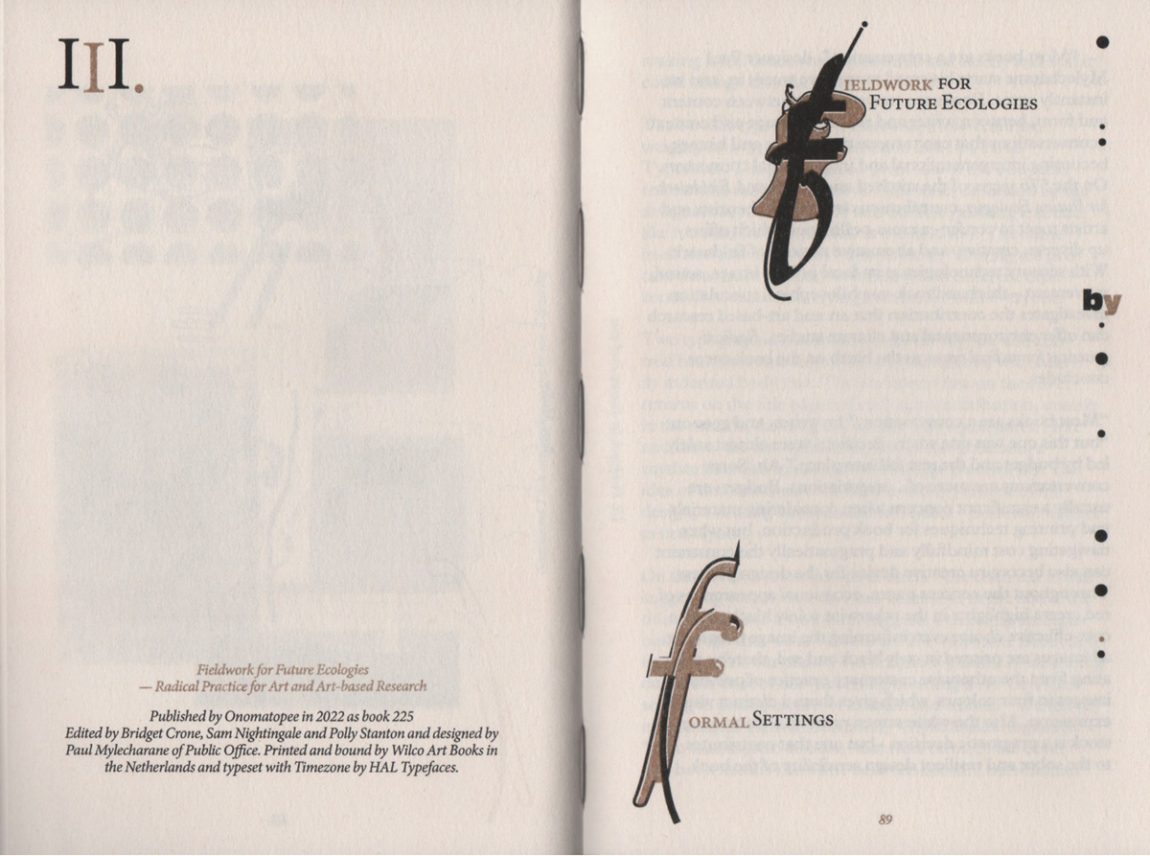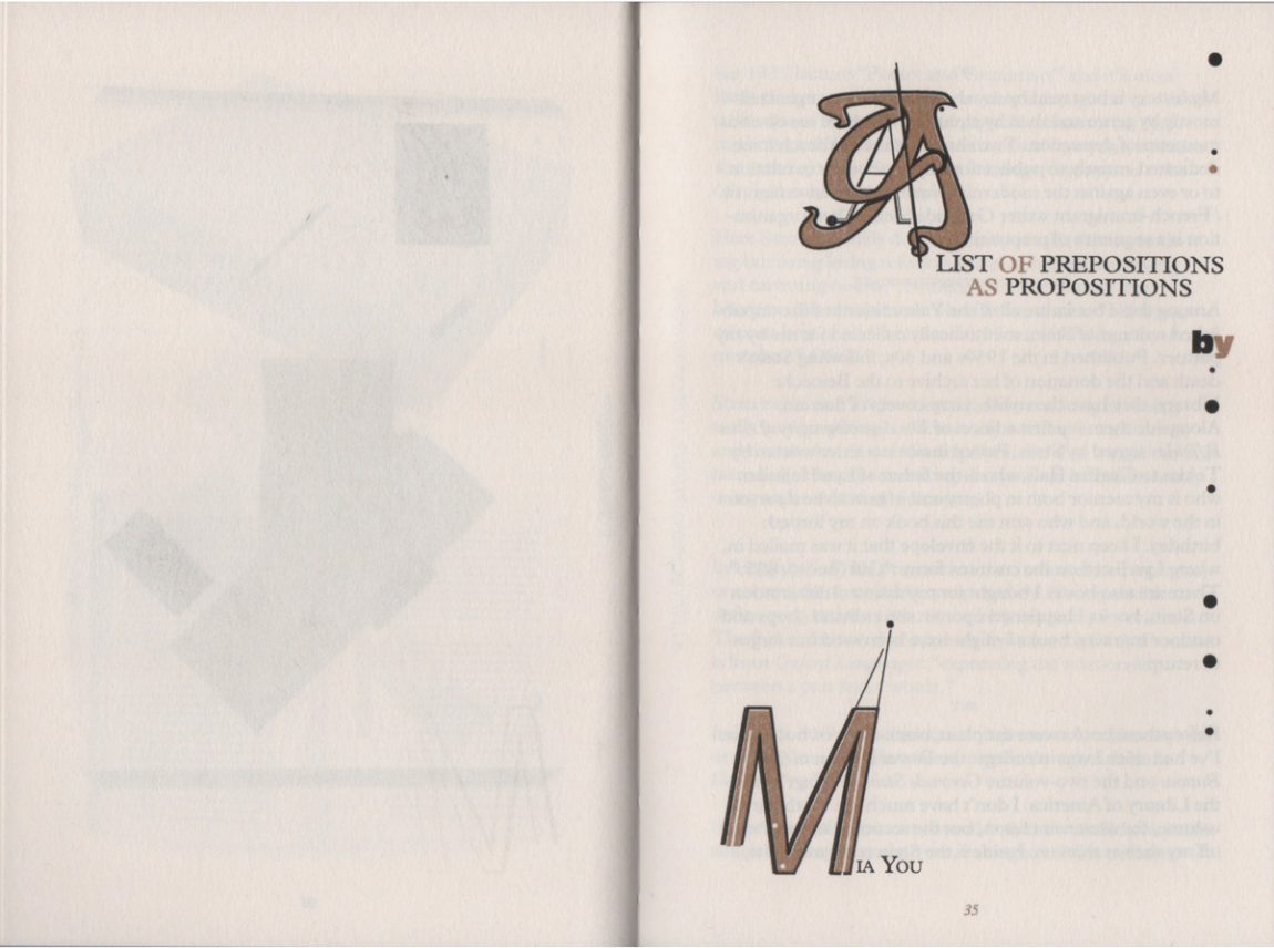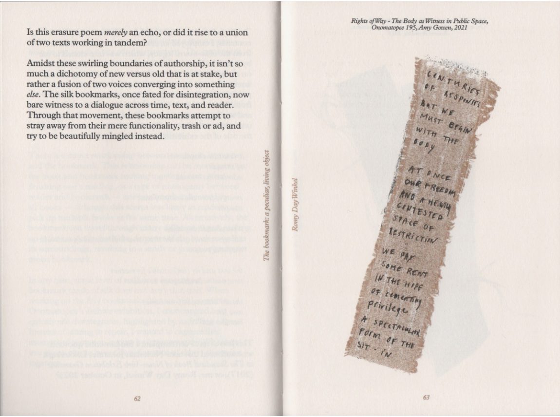 There are compact essays on the design, form and feeling of three of Onomatopee’s publications by Formal Settings, the authors of Notes on Book Design (2023), as well as Ambient Reading, A Method by Sal Randolph. Mia You has contributed A List of Prepositions as Propositions, to which Romy Day Winkel has responded by applying an erasure poetry writing method to fifty silk bookmarks.