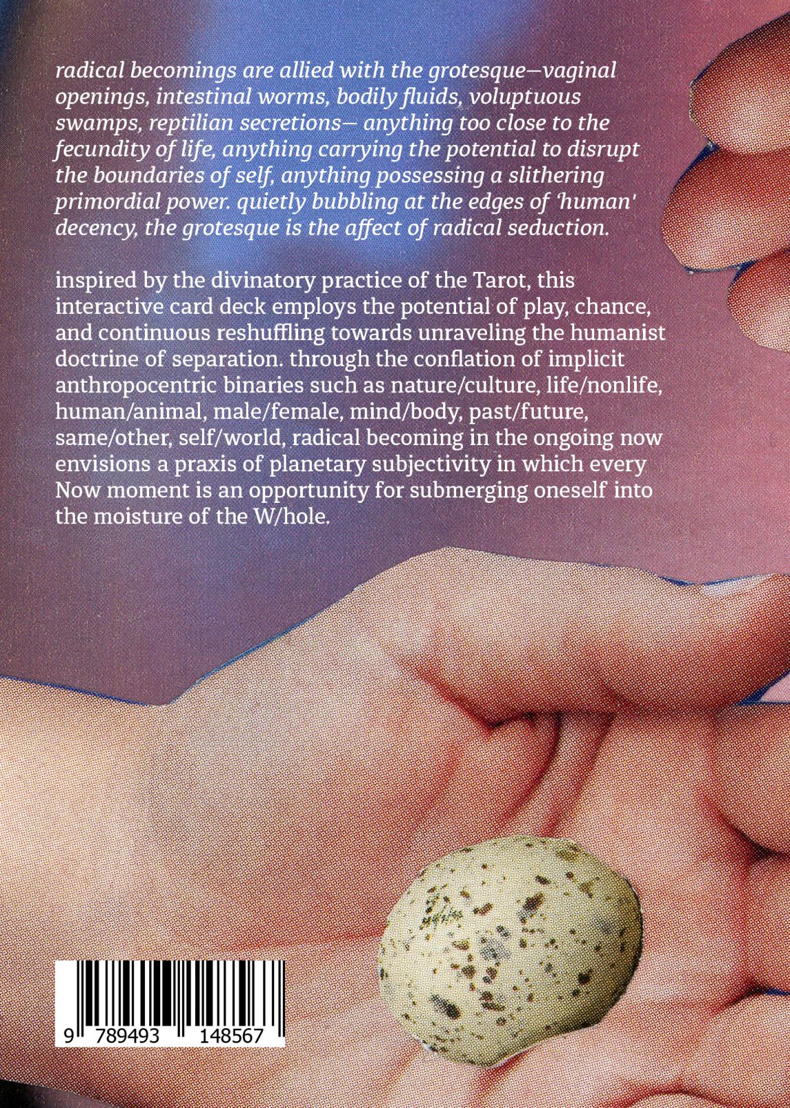 inspired by the divinatory practice of the Tarot, this interactive card deck employs the potential of play, chance, and continuous reshuffling towards unraveling the humanist doctrine of separation. through the conflation of implicit anthropocentric binaries such as nature/culture, life/nonlife, human/animal, male/female, mind/body, past/future, same/other, self/world, radical becoming in the ongoing now envisions a praxis of planetary subjectivity in which every Now moment is an opportunity for submerging oneself into the moisture of the W/hole.