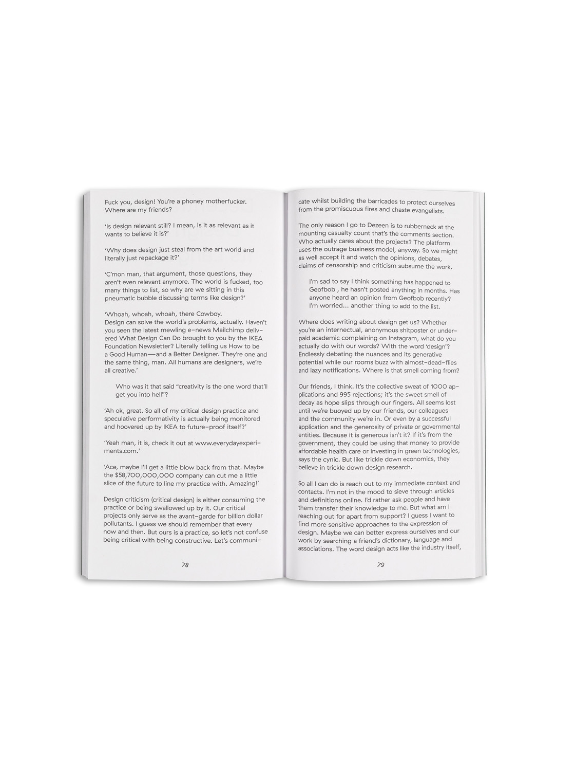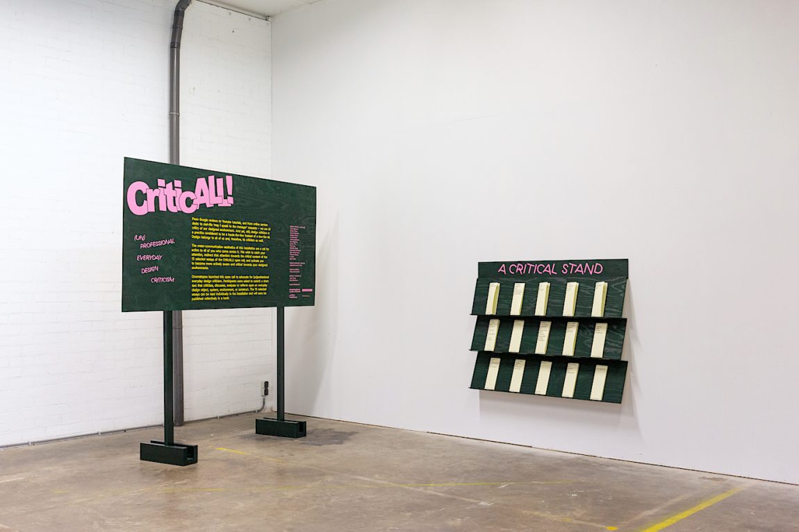 Onomatopee launched an open call to advocate for (un)professional everyday design criticism. Participants were asked to submit a short text that criticizes, discusses, analyzes or reflects upon an everyday design object, system, environment, or construct. The 15 selected essays can be read individually in the installation and will soon be published collectively in a book.