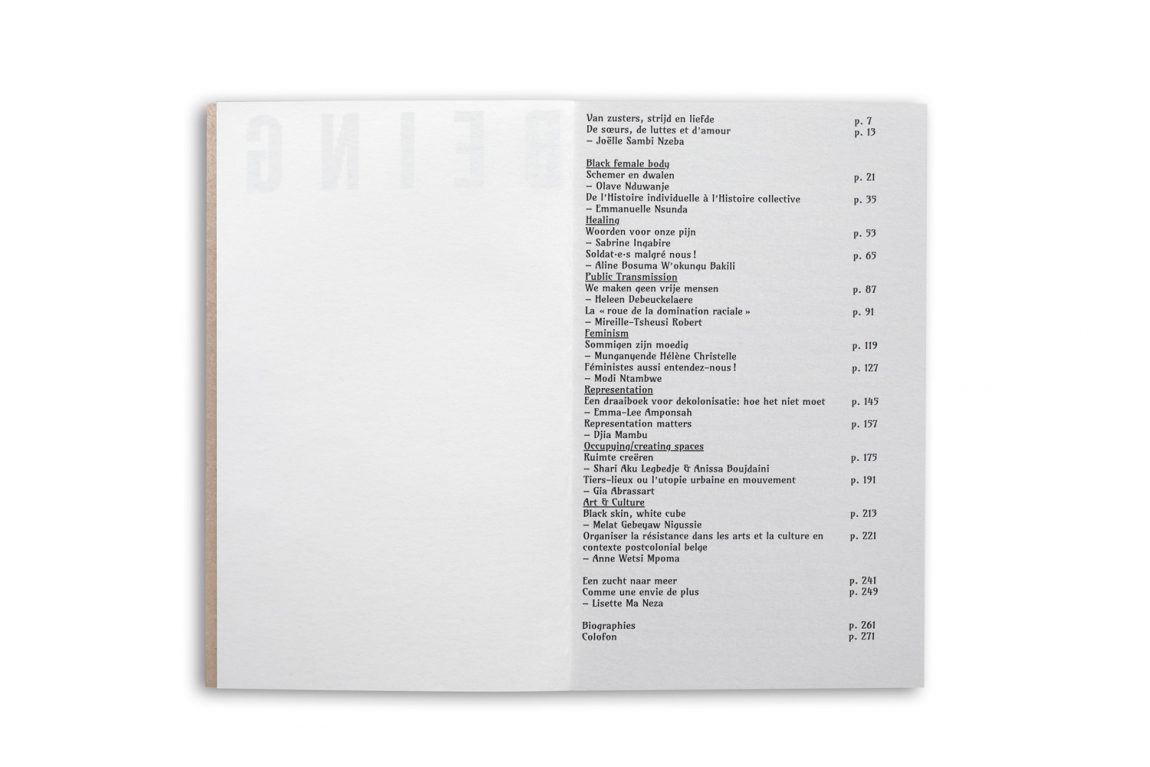 Being is een tijdloze liefdesbrief en handleiding van en voor zwarte vrouwen. Dit boek is een collectie van reflecties over vrouw- én zwart-zijn in België. In de twee landstalen Nederlands en Frans verenigen wij, zwarte vrouwen, non-fictie essays, literaire beschouwingen, poëzie, activistische en academische teksten rond onze zoektocht naar vrijheid. Dit boek is een eerbetoon aan onze ouderen, onze heldinnen en onze zusters.