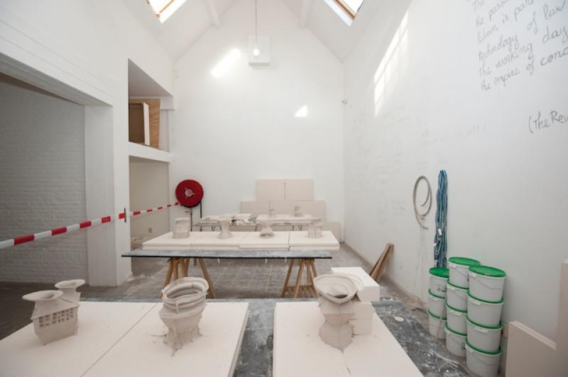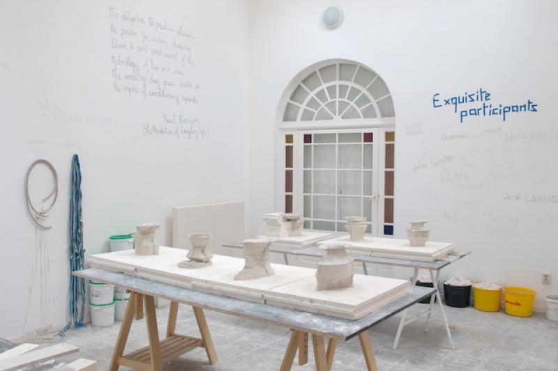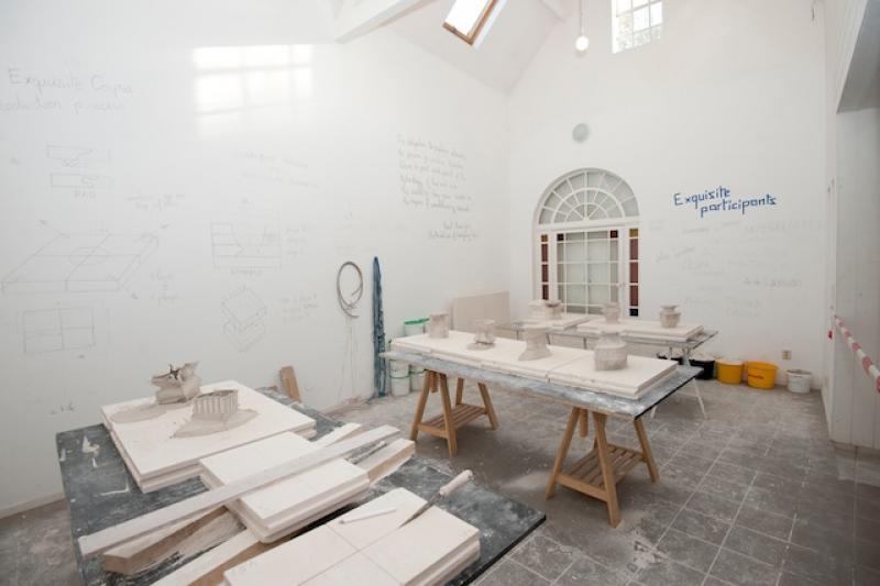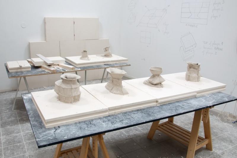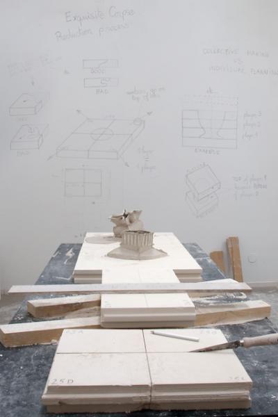 Generally used to quickly put up partition walls, plaster tiles are a amateur building material par excellence. Julien Carretero is using this readily available crude material to set up a domestic production chain. With any kind of household tool the tiles are to be shaped into moulds. Reestablishing an expert production method as domestic craft, Carretero combines skill with available material. With a group of designers he will collaboratively produce new objects using the Surrealist’s exquisite corpse method. Onomatopee will show the results of their labor.