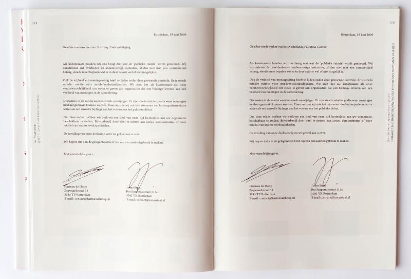 The visual report ‘ACTIVISM DOUBT’, is the vibrant result of a series of public works wherein Jonas Staal and Harmen de Hoop used each other as performers for their work. It resulted in a powerful mapping of artistic possibilities to engage with public space/ the public domain. Mutual tension due to different stances brought in a present-day tension, actual questions of artistic production: is it possible to combine both political as artistic objectives? What is the influence of the artist on the structure and usage of the public domain? Accordingly: what can we learn and experience, being the users of this public domain, when we relate ourselves to this dialogue?