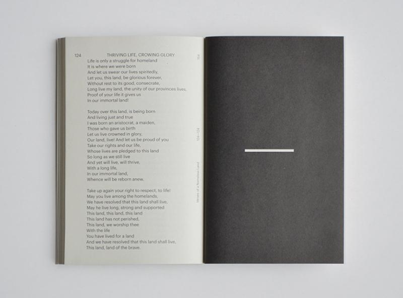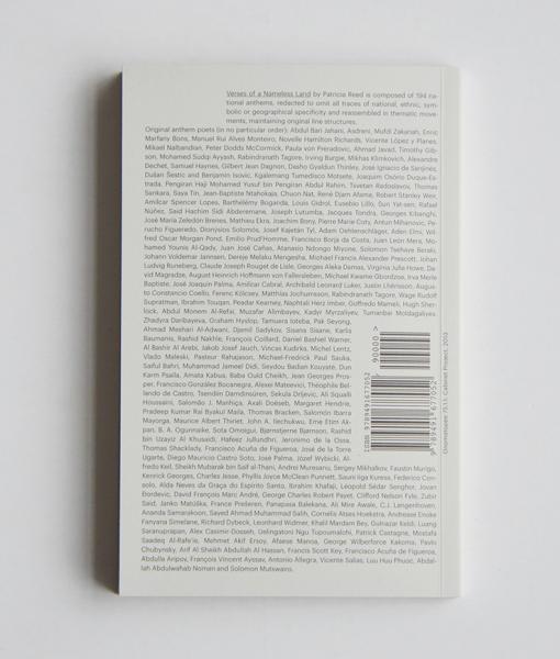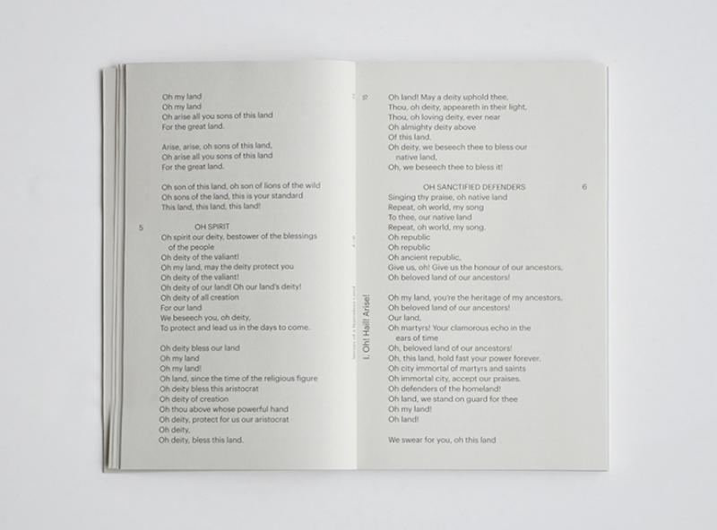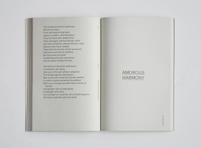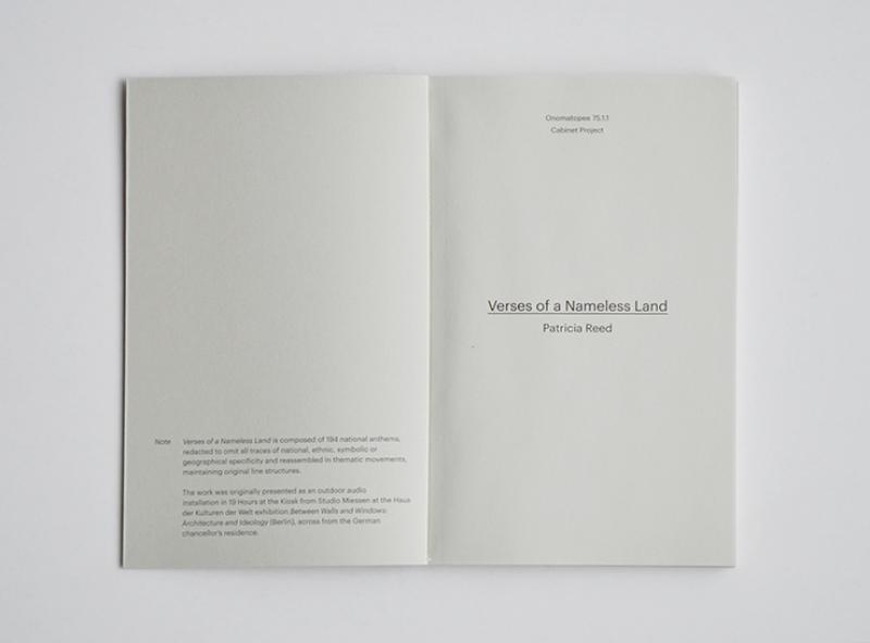 Verses of a Nameless Land by Patricia Reed is composed of 194 national anthems, redacted to omit all traces of national, ethnic, symbolic or geographical specificity and reassembled in thematic move- ments, maintaining original line structures.