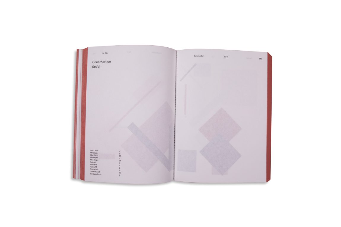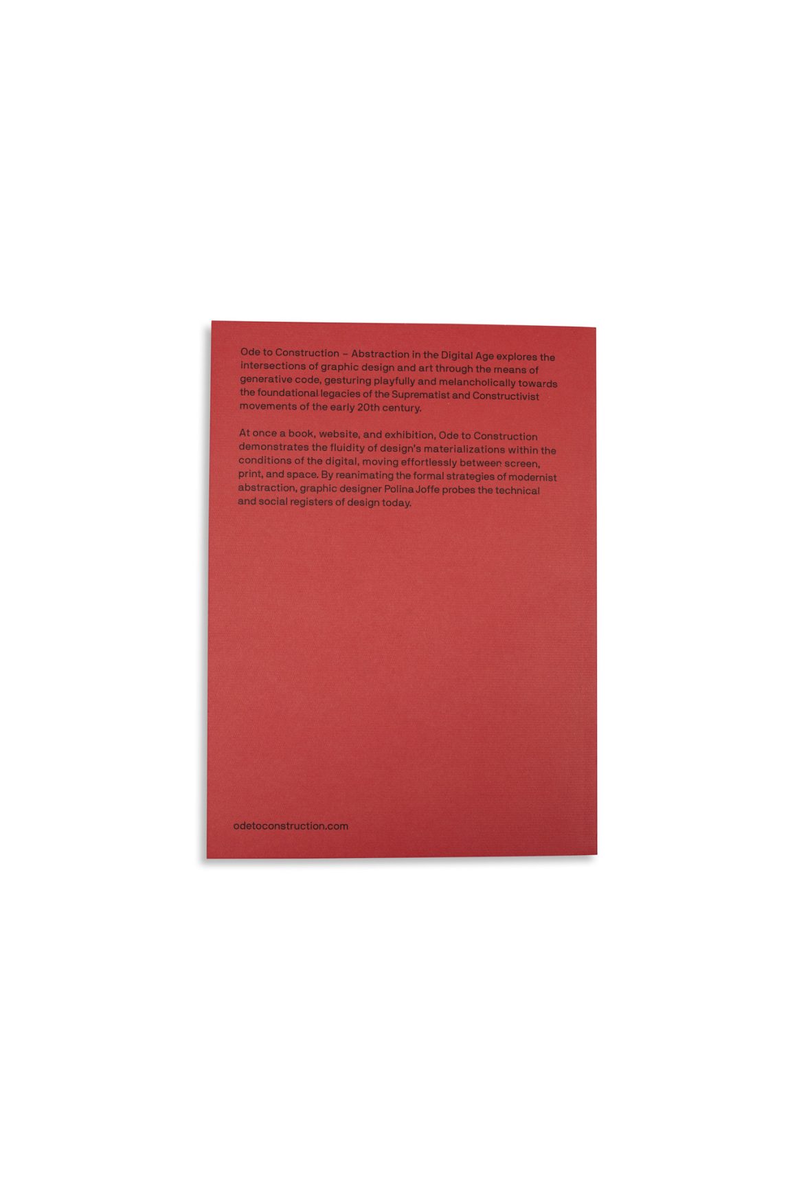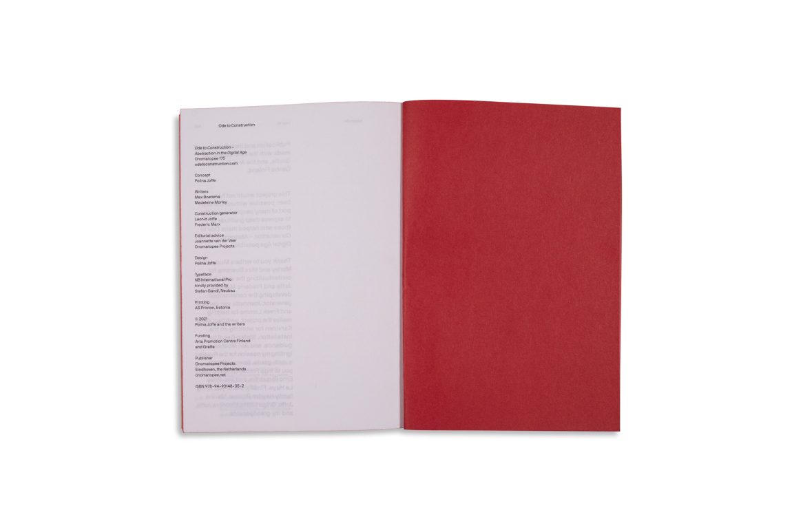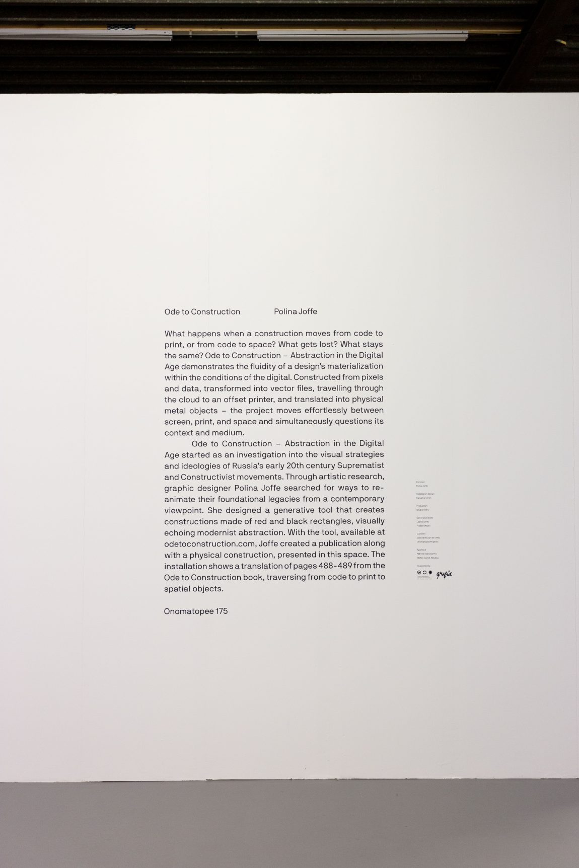Ode to Construction – Abstraction in the Digital Age started as an investigation into the visual strategies and ideologies of Russia’s early 20th century Suprematist and Constructivist movements. Through artistic research, graphic designer Polina Joffe searched for ways to reanimate their foundational legacies from a contemporary viewpoint. She designed a generative tool that creates constructions made of red and black rectangles, visually echoing modernist abstraction. With the tool, available at www.odetoconstruction.com, Joffe created a publication along with a physical construction, as presented at Onomatopee. The installation shows a translation of pages 488-489 from the Ode to Construction book, traversing from code to print to spatial objects.