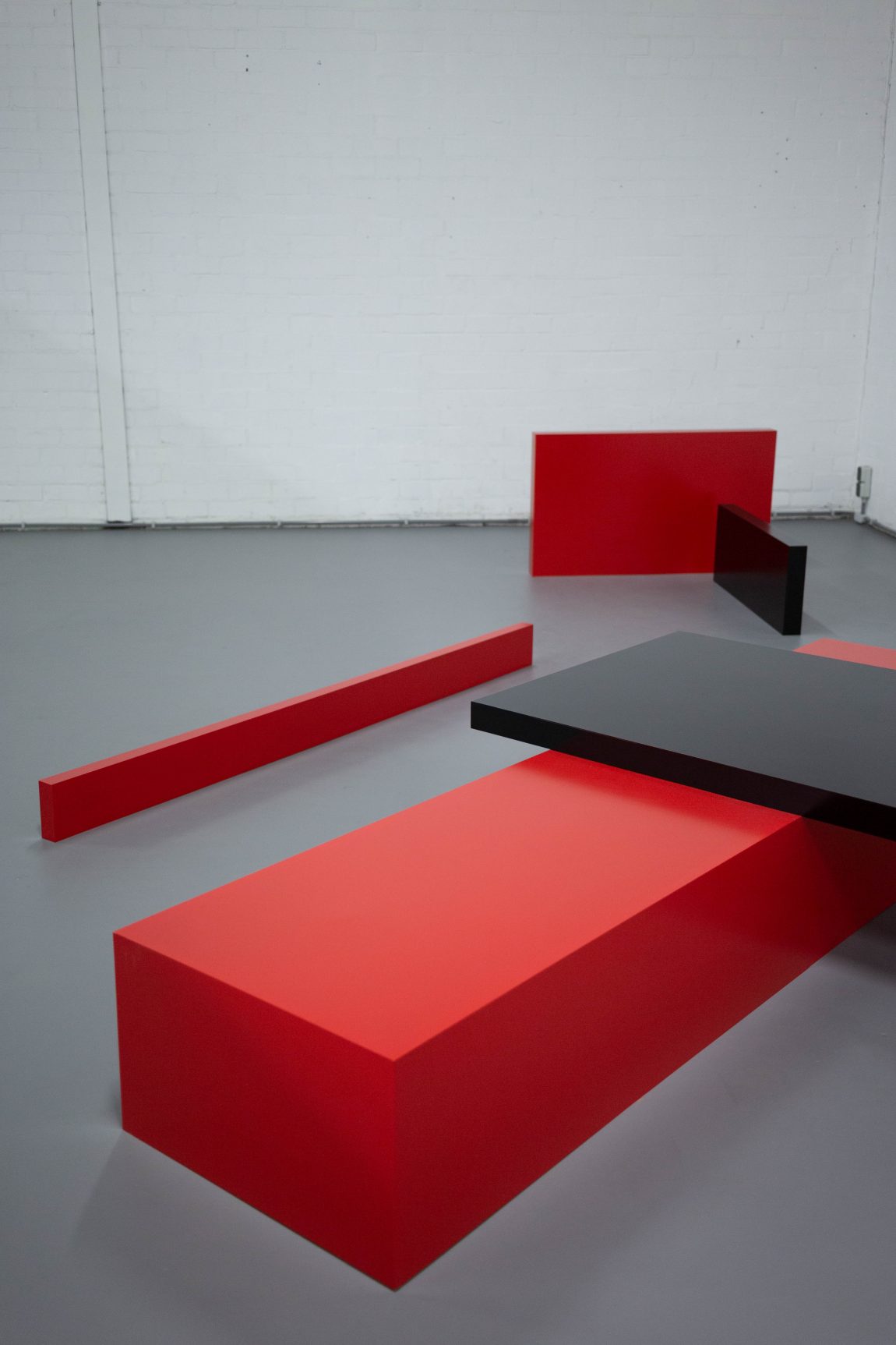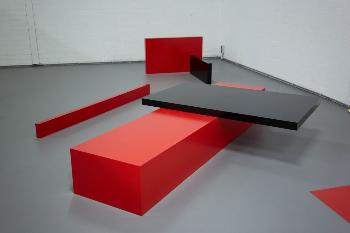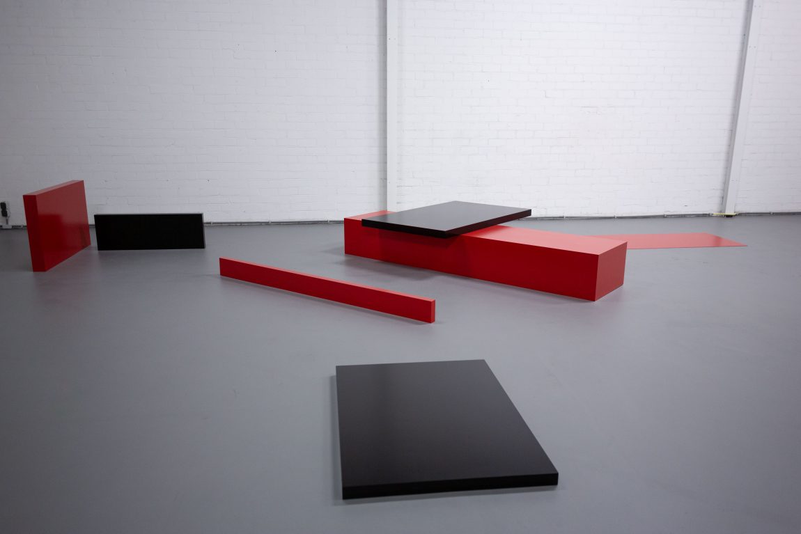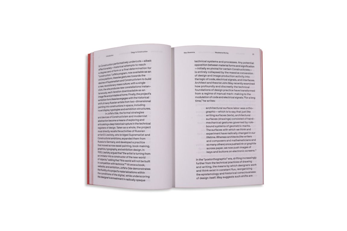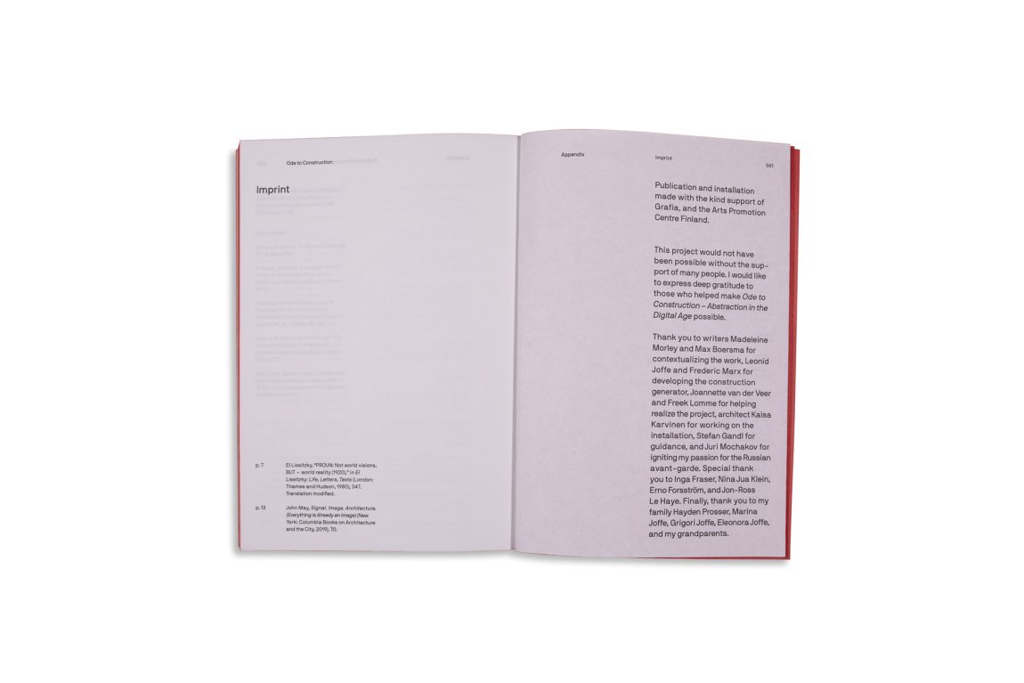 Ode to Construction – Abstraction in the Digital Age started as an investigation into the visual strategies and ideologies of Russia’s early 20th century Suprematist and Constructivist movements. Through artistic research, graphic designer Polina Joffe searched for ways to reanimate their foundational legacies from a contemporary viewpoint. She designed a generative tool that creates constructions made of red and black rectangles, visually echoing modernist abstraction. With the tool, available at www.odetoconstruction.com, Joffe created a publication along with a physical construction, as presented at Onomatopee. The installation shows a translation of pages 488-489 from the Ode to Construction book, traversing from code to print to spatial objects.