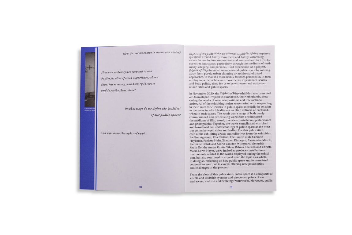 Inspired by the grass-roots testimony, academic resources and critical inquiry offered by poets, theorists, artists, architects and designers, Rights of Way explores the body as witness in public space through a multi-medium format of soundscape, film, oral testimony, interview and text. Portraying differing scales and perspectives, geographical locations and time periods it aims to build upon a multitude of experiences and further the intersections between body, imagination, witnessing and the city, to consider another civil choreography.