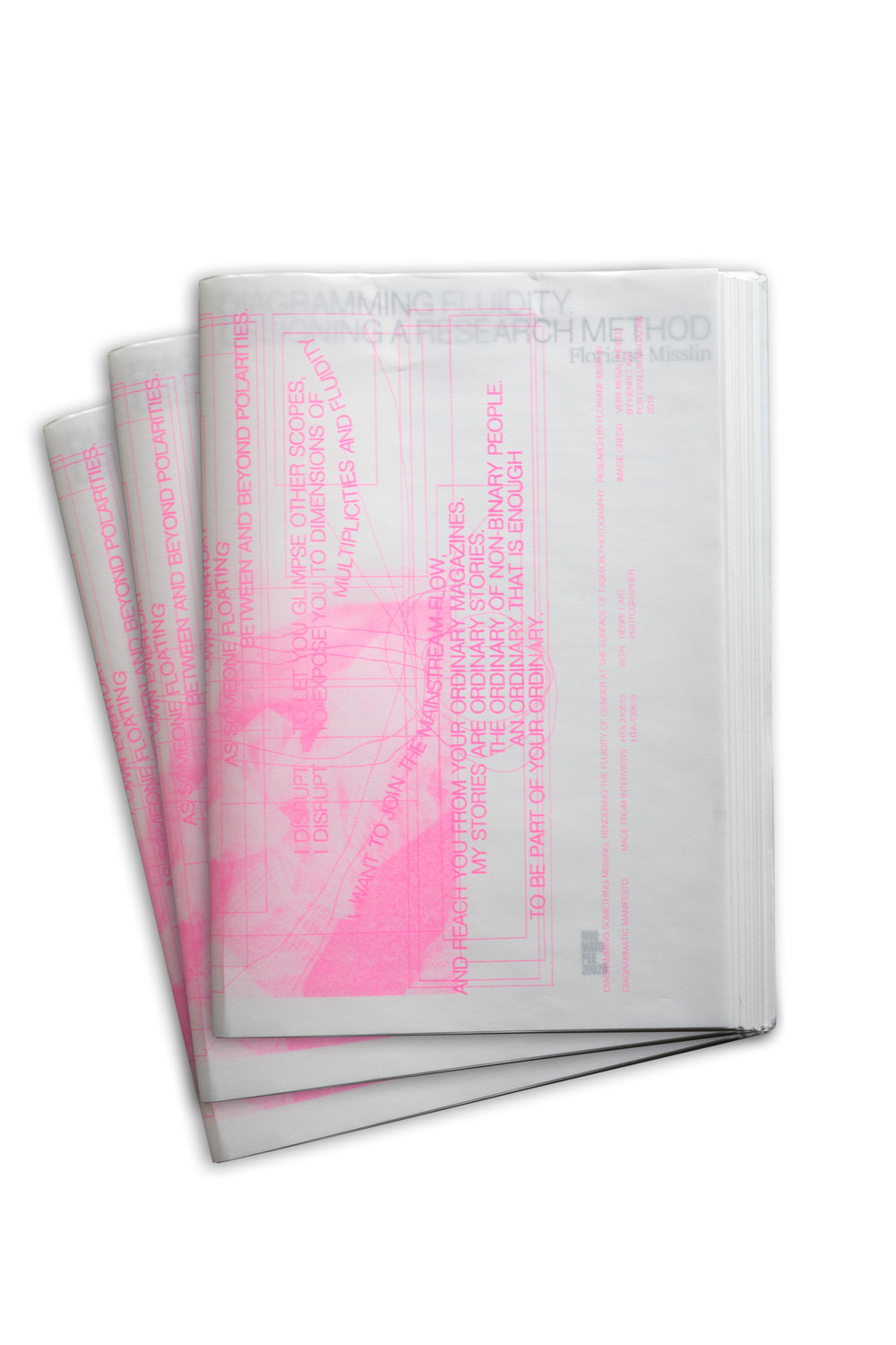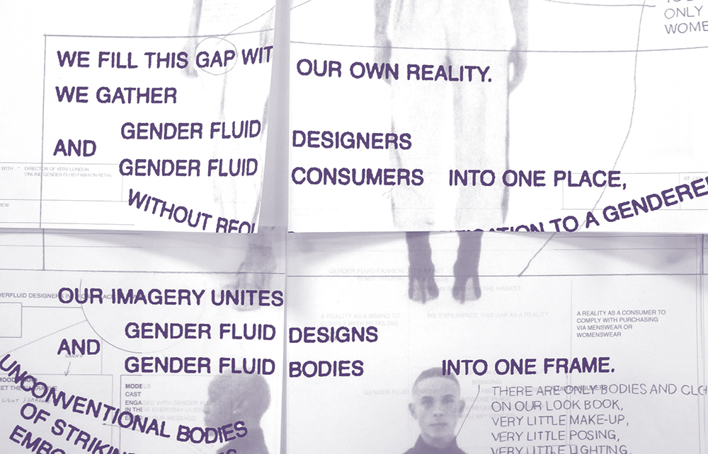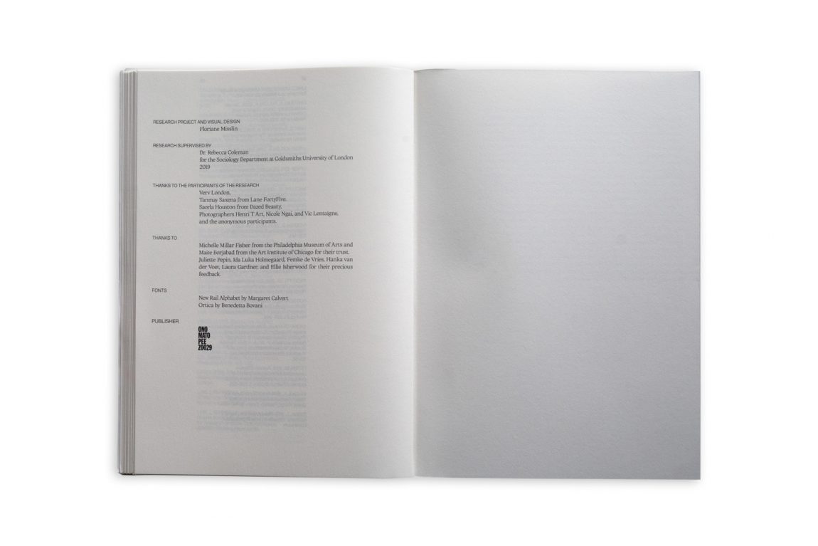 The project outlines the conditions in which the fluidity of gender is being actualized in the production of fashion photography. Floriane Misslin interviewed several practitioners to discuss, question, and reflect upon the past and present of gender fluidity within the field. What gendered divisions have been made so far within fashion (photography)? Is there any room for non-binary visualizations? What is left unsaid, and what is missing? The outcome of the series of interviews is a selection of manifestos that both textually and visually as well as diagrammatically show the different means of making a gender fluid approach to fashion more visible within visual culture.