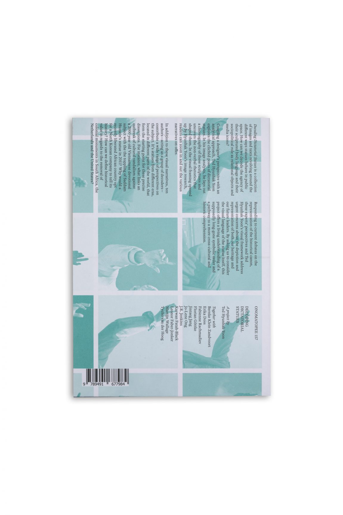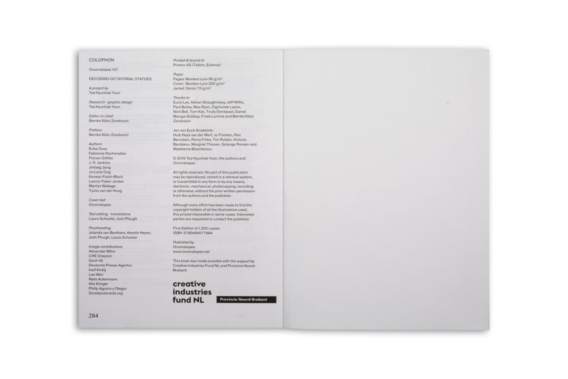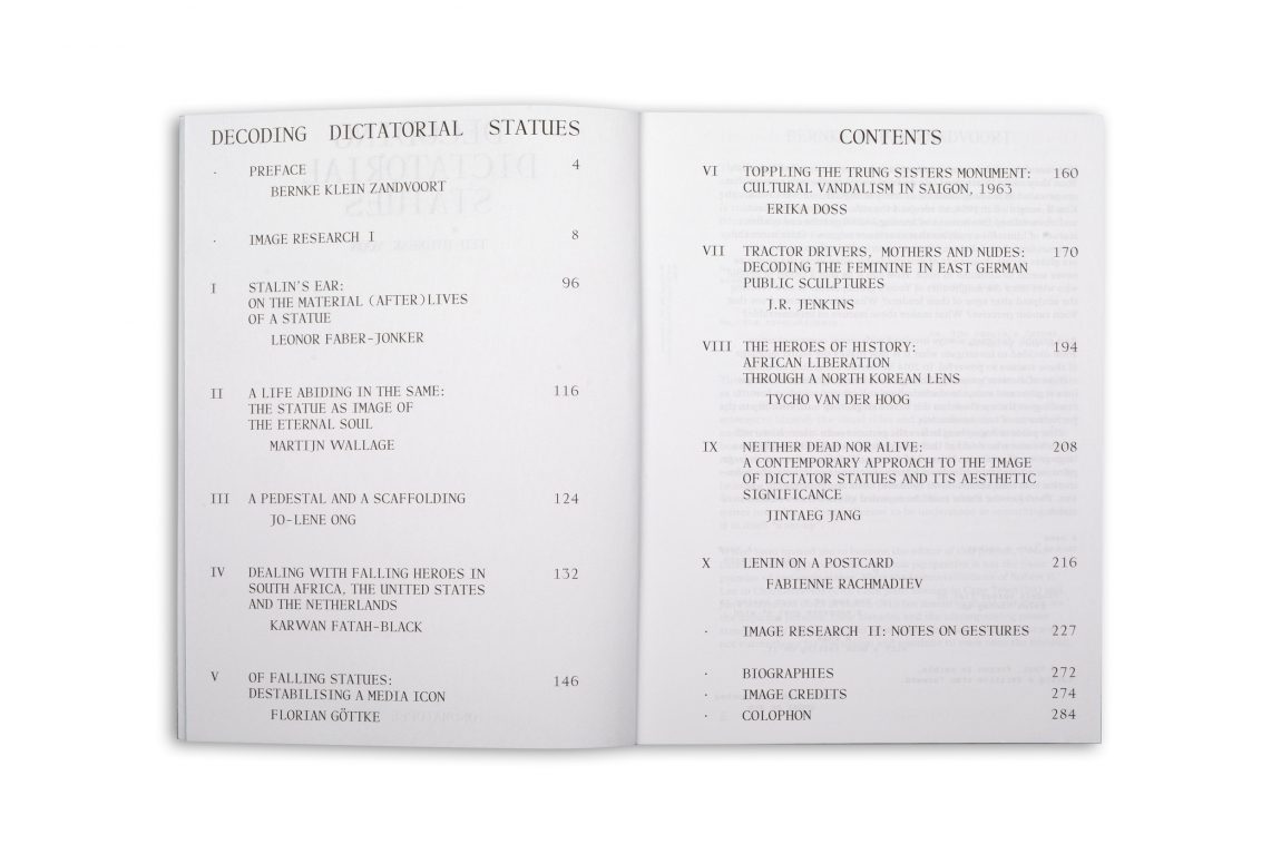 Sparked by a database of images that when organised become a tool for decoding, the publication Decoding Dictatorial Statues by Korean graphic design researcher Ted Hyunhak Yoon, offers a real time analysis, an empirical understanding and data for reflection on gestural politics. While the work forefronts the actual status of statues, the various texts, collected by writer Bernke Klein Zandvoort, revolve around the different ways we can look at statues in public space. How can we decode statues and their visual languages, their object hood and materiality, their role as media icons and their voice in political debates?