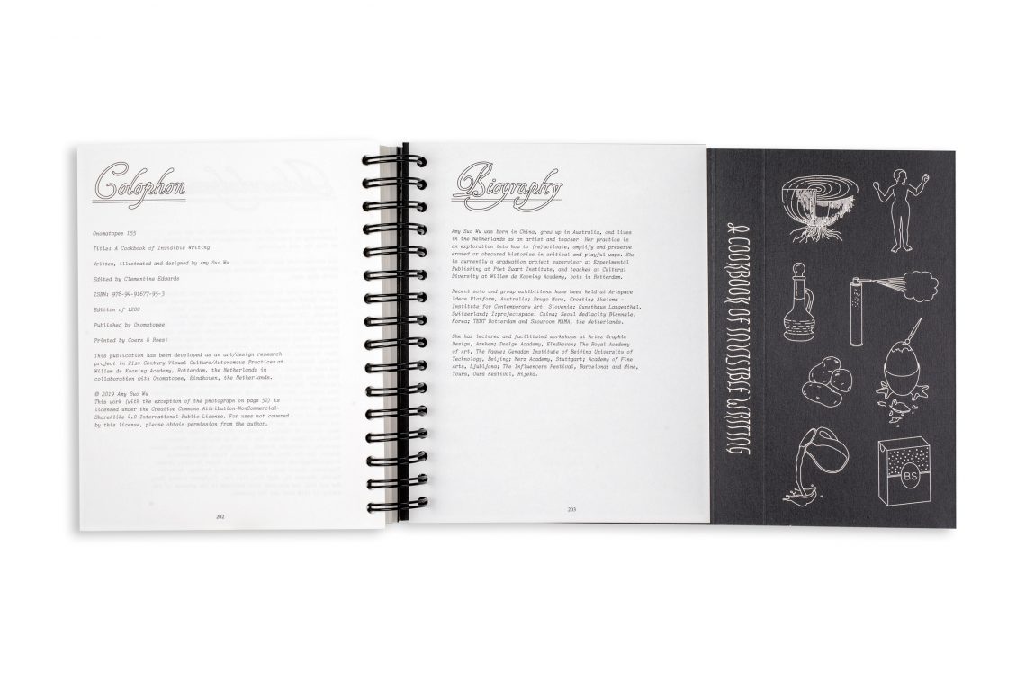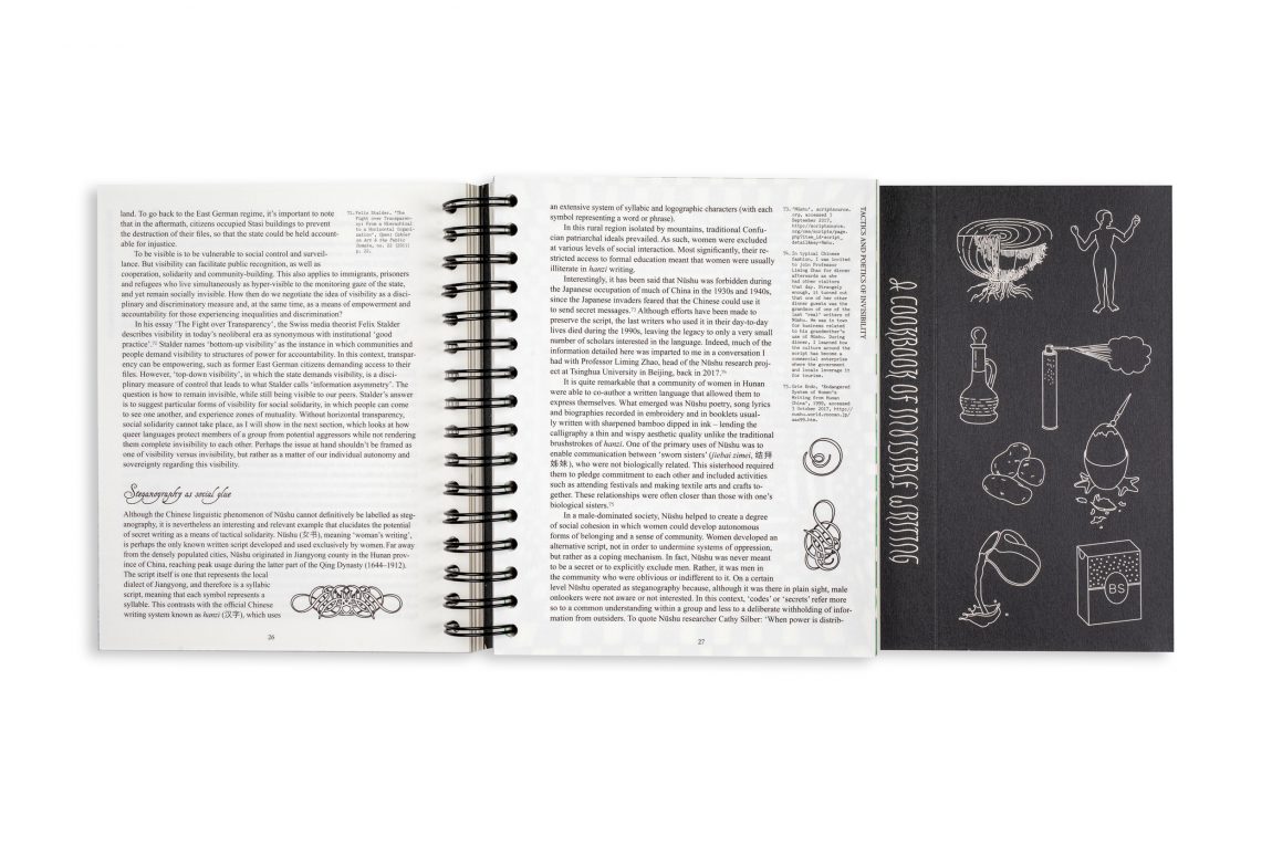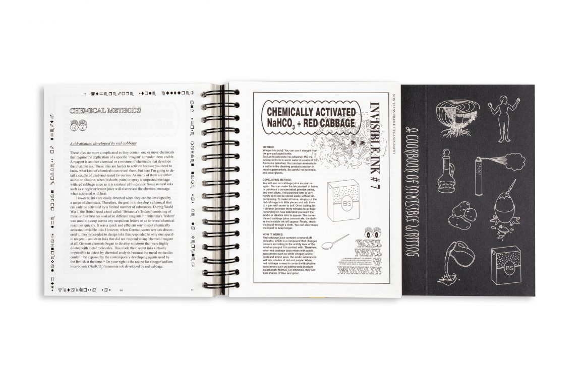 ‘A Cookbook of Invisible Writing’, written and designed by Amy Wu, is an introduction to analog steganography, a type of secret writing that is hidden in plain sight. It is an invisible ink colouring book, recipe book, puzzle book and artistic research book. This book also serves as a starter pack to run workshops for those who are interested in alternative forms of communication. A Cookbook of Invisible Writing provides a wide variety of invisible ink recipes and other communication techniques that may be used to subvert surveillance, bypass censorship and make visible the struggles of minorities and other marginalised cultures. Additionally, it aims to inspire communities to develop their own new poetic and playful forms of communication as a way of nurturing social bonds.
