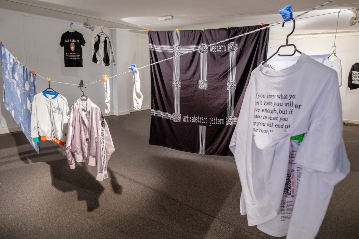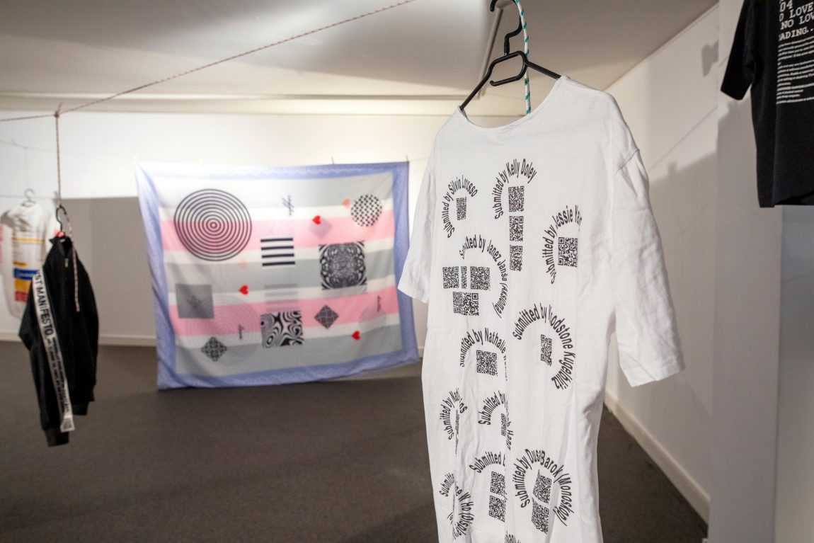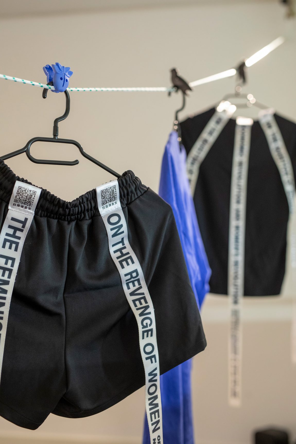 Hutong Whispersco-opts three elements that are omnipresent in the Chinese urban landscape, namely bed sheets, Shanzhai fashion (a Chinese phenomenon that features nonsense English), and QR codes.