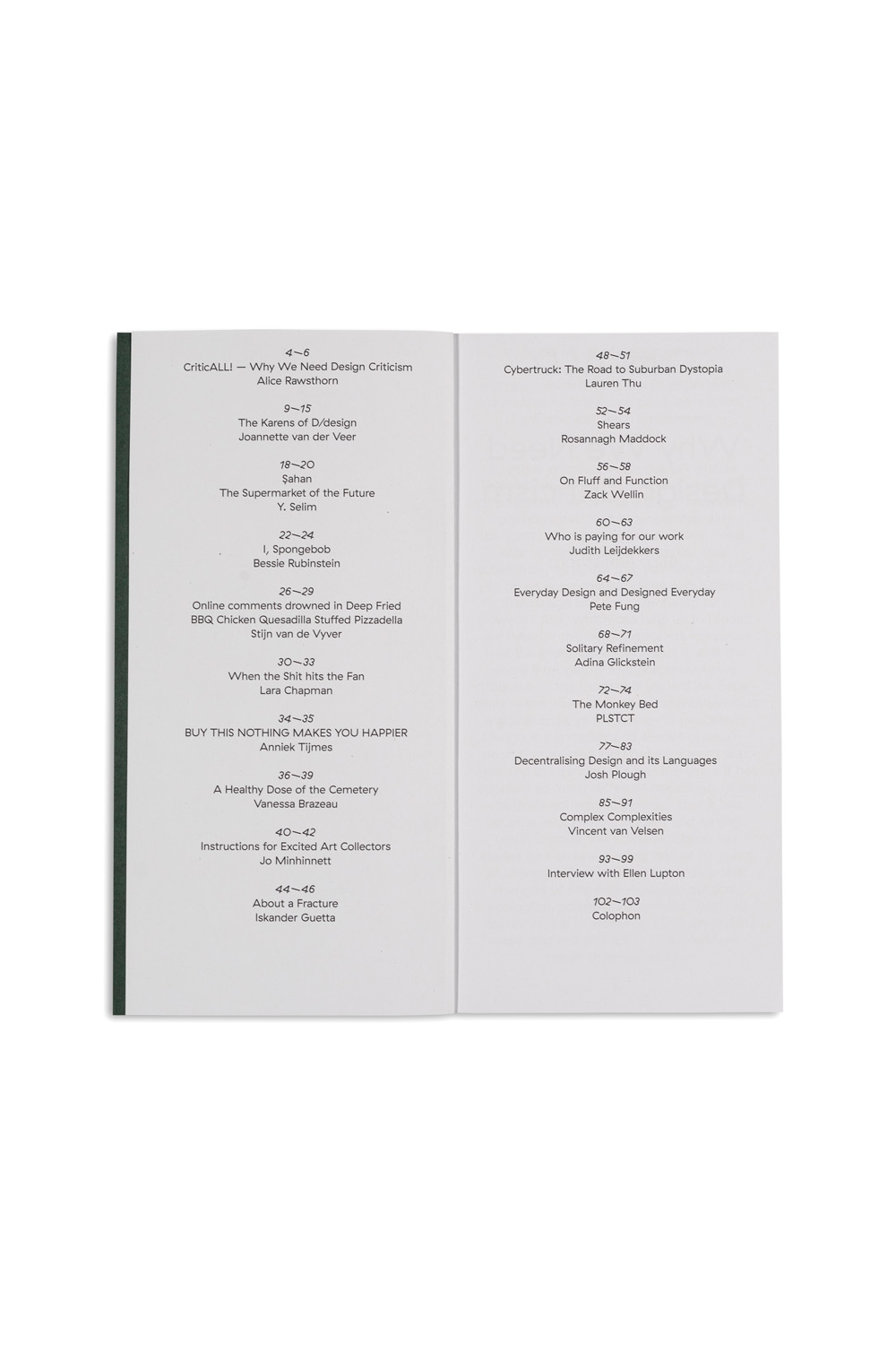 Adina Glickstein, Anniek Tijmes, Bessie Rubinstein, Iskander Guetta, Jo Minhinnett, Judith Leijdekkers, Lara Chapman, Lauren Thu, Pete Fung, Plasticity Studio, Rosannagh Maddock, Stijn van de Vyver, Vanessa Brazeau, Y. Selim, Zack Wellin